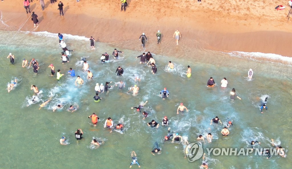 이 대회는 겨울 바다 수영이라는 이색 체험을 하며 새해 소망을 기원하는 행사다. 2023.1.1 atoz@yna.co.kr |