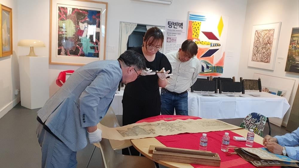 | ▲ LA서 개최한 환수 문화유산 공개 전시회 남지은 연구원(가운데)이 지난 9월 5일 LA 한인타운 리수갤러리에서 진행된 '환수 문화유산 공개 전시회'에서 문화재를 감정하고 있다. [남지은 제공] |