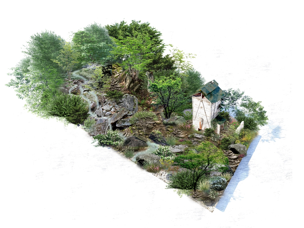 깊은 숲속 지형의 높낮이와 다양한 종의 서식 환경, 일조량을 만드는 크고 작은 교·관목과 겹겹이 쌓인 바위 위에 흐르는 물로 습도를 조절하고 약초의 다양한 종의 생장 환경을 표현할 예정이다. 여기에 약초꾼들의 건조장까지도 연출한다는 구상이다.