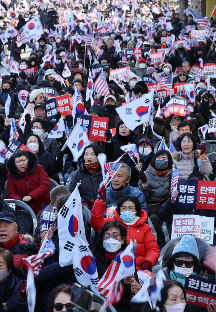 Supporters of impeached President Yoon Suk Yeol shout slogans during a rally near the Constitutional Court in Seoul on Jan. 23, 2025, to express their objection to Yoon's impeachment. Yoon attended the fourth hearing of his impeachment trial at the court in connection with his short-lived imposition of martial law in December. (Pool photo) (Yonhap)
