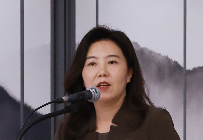 Kang Yu-jung, spokeswoman for the Democratic Party (DP), is introduced as President Lee Jae-myung nominates her as his presidential spokesperson during a press conference at the presidential office in Seoul on June 4, 2025, marking his first personnel announcement since his inauguration earlier in the day. (Yonhap)