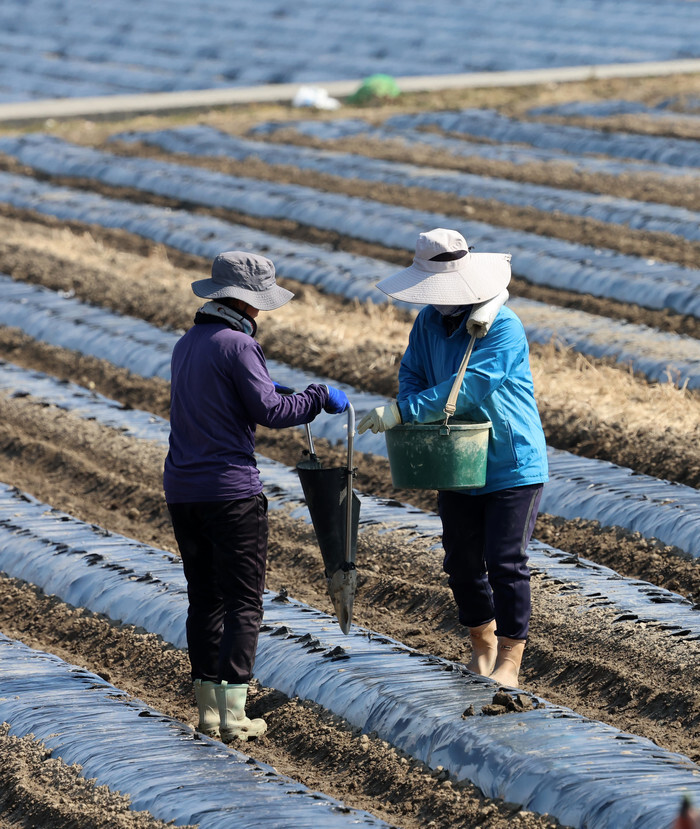Farmers plant seed potatoes in a field in the city of Gangneung, Gangwon Province, eastern South Korea, on March 10, 2025. (Yonhap)