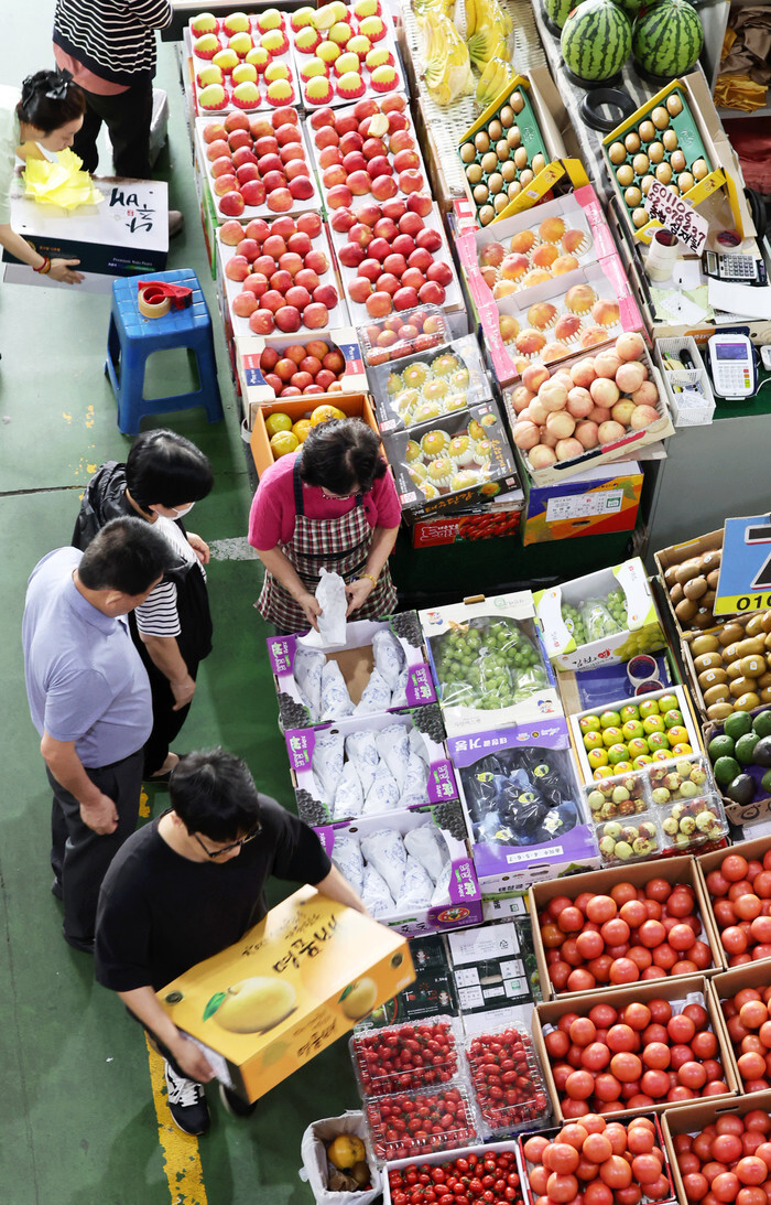 Shoppers browse boxes of fruits at a wholesale market for farm and fishery products in the southwestern city of Gwangju on Sept. 30, 2025, ahead of Chuseok, the Korean harvest holiday that falls on Oct. 6 this year and is part of a seven-day break. (Yonhap)