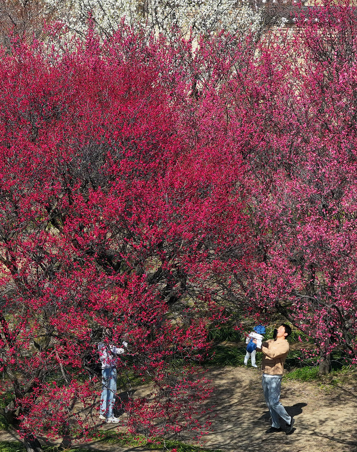Visitors enjoy red plum blossoms in a village, where descendants of the Nampyeong Moon clan have lived, in the southeastern city of Daegu on March 21, 2025. The clan, which has the surname of Moon, hails from the town of Nampyeong in the southwestern city of Naju. (Yonhap)