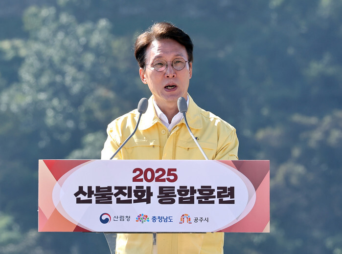 Disaster drill against wildfires Prime Minister Kim Min-seok speaks during a wildfire drill at Gongsan Castle in Gongju, South Chungcheong Province, central South Korea, on Oct. 22, 2025. (Yonhap) (END)