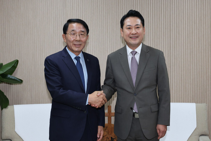 Jang Dong-hyeok (R), leader of the main opposition People Power Party, poses for a photo with Rev. Kim Jong-saeng, secretary general of the National Council of Churches in Korea, during their meeting at the council's headquarters in Seoul on Sept. 16, 2025. (Pool photo) (Yonhap)