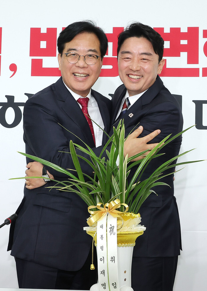 Song Eon-seog (L), newly elected floor leader of the opposition People Power Party, meets with presidential chief of staff Kang Hoon-shik during their meeting at the National Assembly in Seoul on June 17, 2025. (Yonhap)