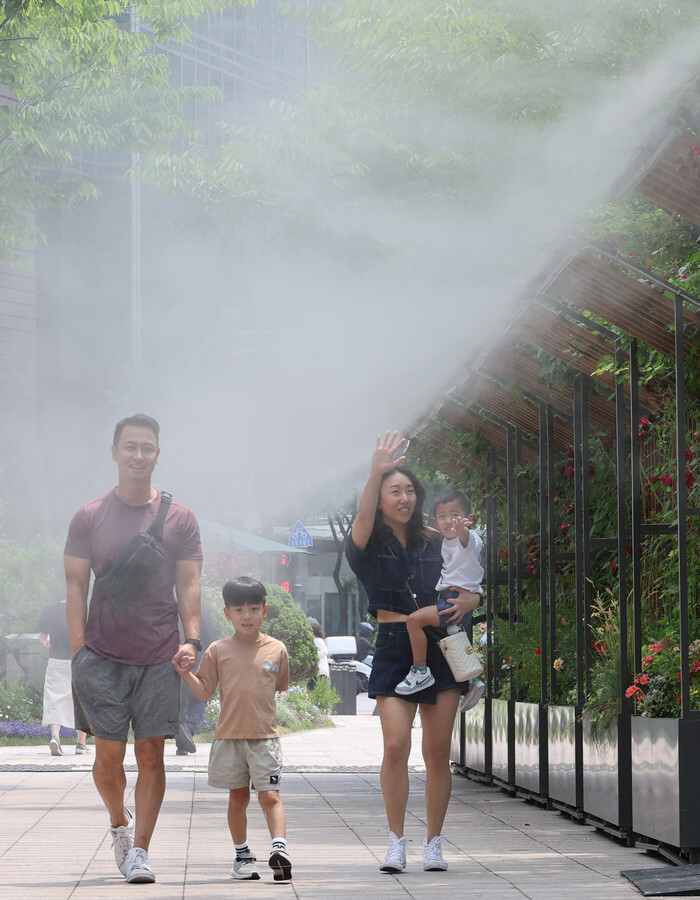 People walk under a cooling fog system, through which water is turned into a fine mist to cool the hot air, in front of City Hall in Seoul on June 17, 2025, as South Korea is gripped by hot weather, with the temperature climbing to 30 C in the capital. (Yonhap)