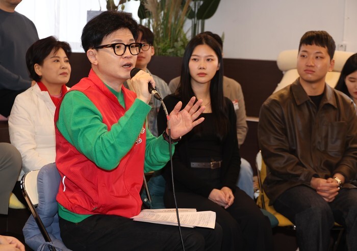 Han Dong-hoon (L), interim leader of the ruling People Power Party, speaks to climate-related startup operators at a cafe in Seoul on Feb. 27, 2024, after announcing the party's pledges to counter the climate crisis ahead of the April 10 general elections. (Yonhap)