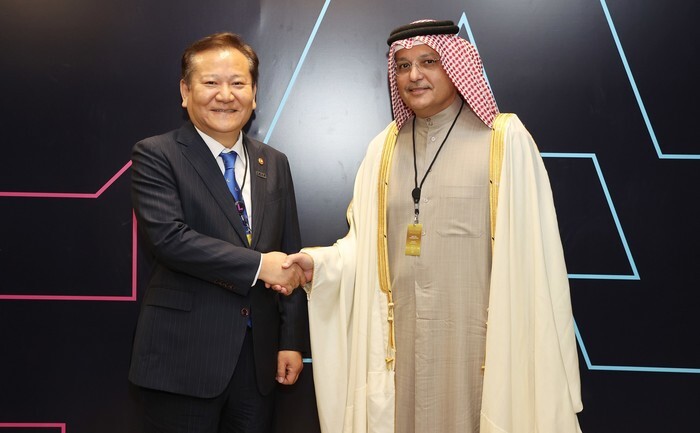 South Korean Interior Minister Lee Sang-min (L) poses for a photo with Qatar's Communications and Information Technology Minister Mohammed bin Ali bin Mohammed Al Mannai prior to their talks at the Riyadh Exhibition and Convention Center, Malham, Saudi Arabia, on March 4, 2024, in this photo provided by the interior ministry. (PHOTO NOT FOR SALE) (Yonhap)