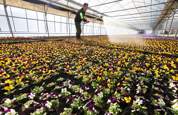 An official of a flower nursery in Anyang, south of Seoul, waters flowers that will be transplanted to flower gardens or parks in the spring on Feb. 17, 2025. (Yonhap)