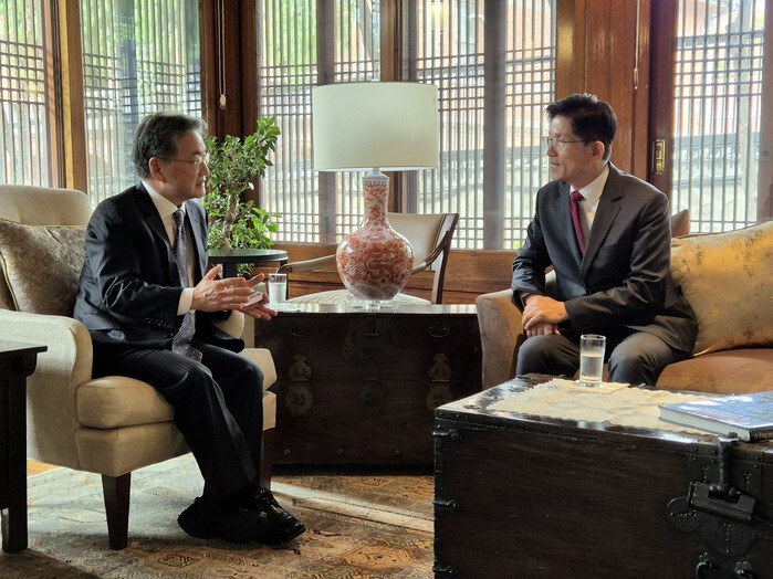 Kim Moon-soo (R), the presidential candidate of the conservative People Power Party, talks with acting U.S. Ambassador to South Korea Joseph Yun during their meeting at the U.S. Embassy in Seoul on May 15, 2025, in this photo released by the party. (PHOTO NOT FOR SALE) (Yonhap)