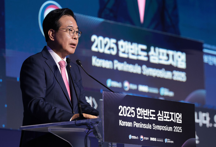 Song Eon-seog, floor leader of the opposition People Power Party, speaks during a symposium, hosted by Yonhap News Agency, at a hotel in Seoul on June 26, 2025, to explore policy recommendations for the new Lee Jae Myung administration. The annual Korean Peninsula Symposium, held amid rising global security uncertainties driven by the intensifying U.S.-China rivalry and growing protectionism, was co-hosted by the Ministry of Unification and the Institute for National Security Strategy. (Yonhap)