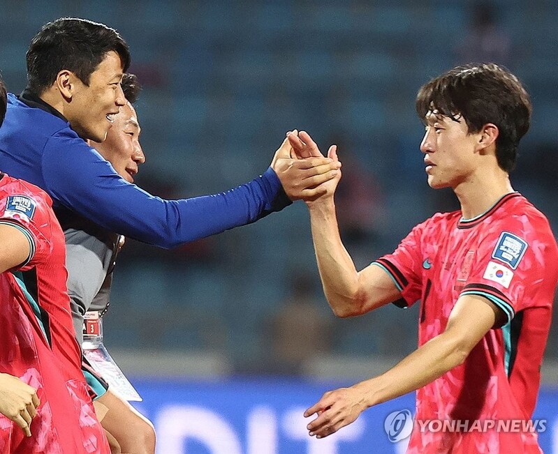 | ▲ 하이파이브하는 황희찬-이재성 (암만[요르단]=연합뉴스) 류영석 기자 = 10일(현지시간) 요르단 암만국제경기장에서 열린 2026 피파 북중미월드컵 아시아 3차 예선 3차전 한국과 요르단의 경기가 끝난 뒤 경기에서 부상을 당한 황희찬이 팀 관계자에게 업힌 채 이재성과 하이파이브를 하고 있다. 이날 대표팀은 이재성, 오현규의 골로 요르단을 2대0으로 제압했다. 2024.10.11 ondol@yna.co.kr |