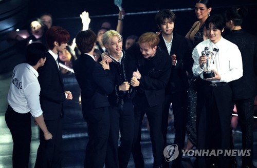 | ▲ K-pop boy group Stray Kids reacts on stage after accepting Best K-pop at the 2023 MTV Video Music Awards on Sept. 12, 2023, in Newark, New Jersey, in this Reuters photo. (Yonhap) |