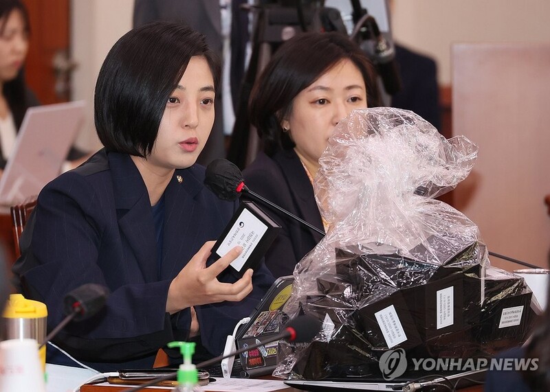 | ▲ 류호정, 자료 제출 요청에 usb 자료가 우수수 (서울=연합뉴스) 이정훈 기자 = 정의당 류호정 의원이 10일 국회 문화체육관광위원회에서 열린 문화체육관광부 국정감사에서 usb 형태로 제출된 자료를 들어 보이며 의사진행 발언을 하고 있다. 2023.10.10 uwg806@yna.co.kr |