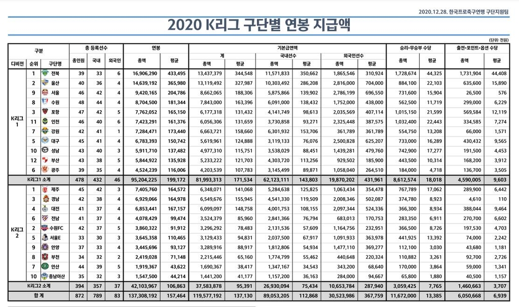 한국프로축구연맹은 2020시즌 K리그1(1부리그) 11개 구단(군팀 상주 상무 제외)과 K리그2(2부리그) 10개 구단의 선수단 연봉 지출 현황을 28일 발표했다.