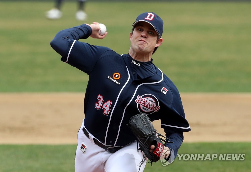 | ▲  In this file photo from March 21, 2022, Robert Stock of the Doosan Bears pitches against the Kia Tigers during the bottom of the first inning of a Korea Baseball Organization preseason game at Gwangju-Kia Champions Field in Gwangju, some 330 kilometers south of Seoul. (Yonhap) |
