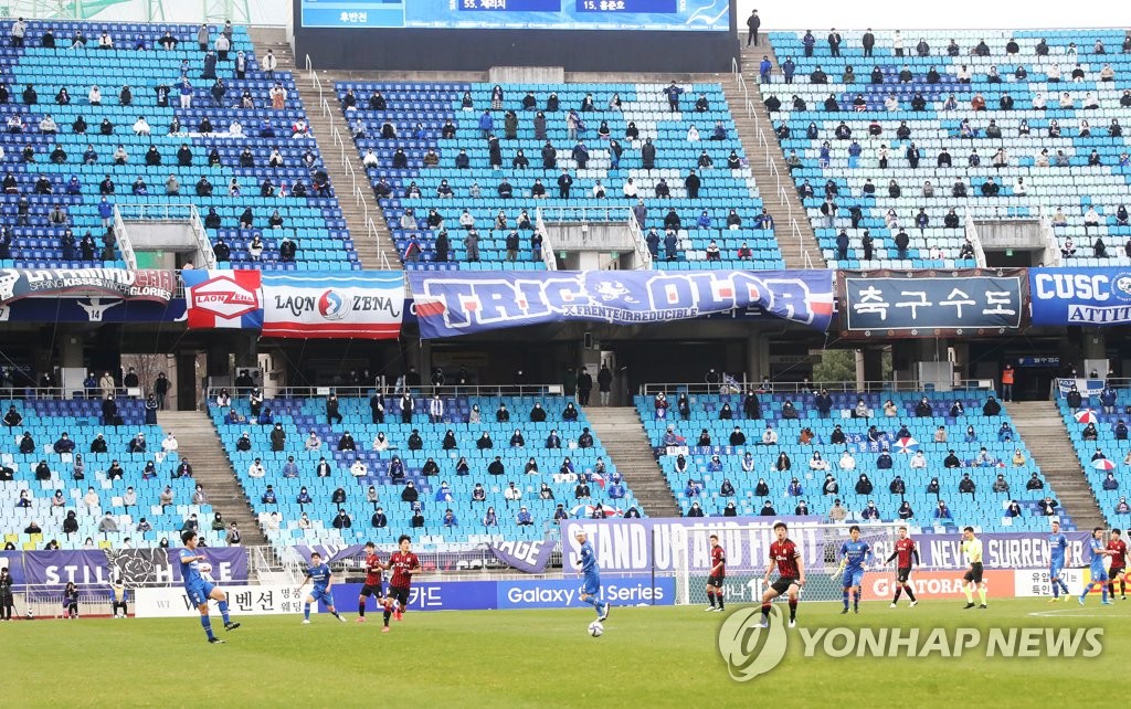 | ▲ This file photo from March 21, 2021, shows fans attending a K League 1 match between Suwon Samsung Bluewings and FC Seoul at Suwon World Cup Stadium in Suwon, 46 kilometers south of Seoul. (Yonhap) |