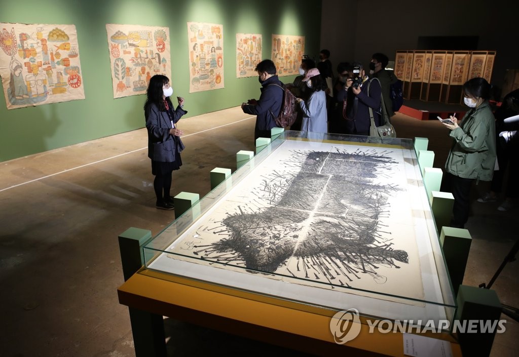 | ▲ 광주비엔날레 전시작품 공개 (광주=연합뉴스) 조남수 기자 = 제13회 광주비엔날레 개막을 하루 앞둔 31일 오전 광주 북구 비엔날레 전시관에서 열린 프레스 투어 행사에서 작품들이 공개되고 있다. 2021.3.31 iso64@yna.co.kr |