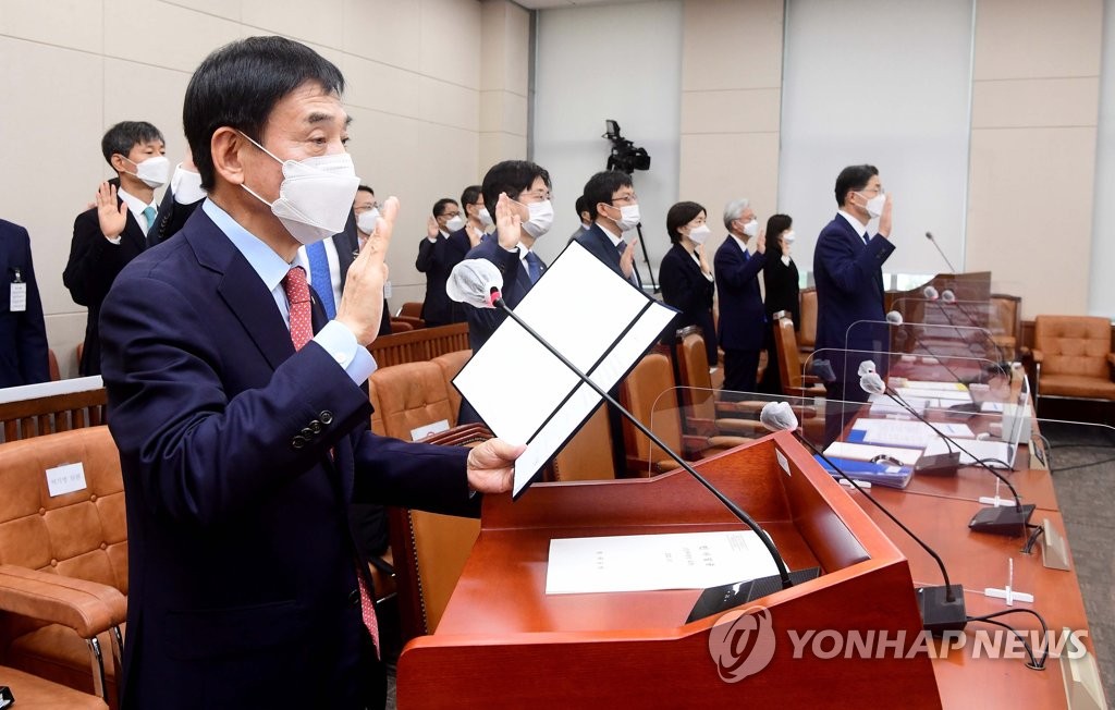 | ▲ In the file photo, Bank of Korea Gov. Lee Ju-yeol takes an oath during an inspection by the National Assembly's planning and finance committee of the central bank in Seoul on Oct. 15, 2021. (Pool photo) (Yonhap) |