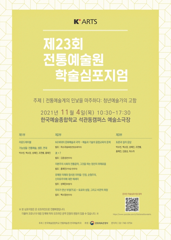 2부에선 각 연구자가 'MZ세대의 문화예술과 국악-예술과 기술의 융합교육의 문제' '자본주의 사회의 전통음악, 그것을 하는 청년의 위태로움' '우리가 만난 부정(不正)-토로와 성찰, 그리고 비관적 희망' 등을 주제로 발표한다.