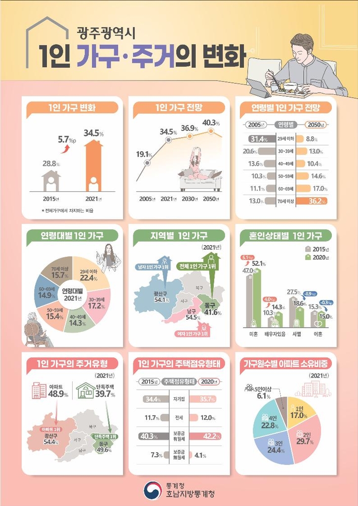 9일 호남지방통계청이 발표한 1인 가구·주거 변화 실태에 따르면 광주는 전체 가구(61만5천693가구) 중 34.5%(21만 2천385가구)가 이른바 나홀로 사는 1인 가구로 집계됐다.