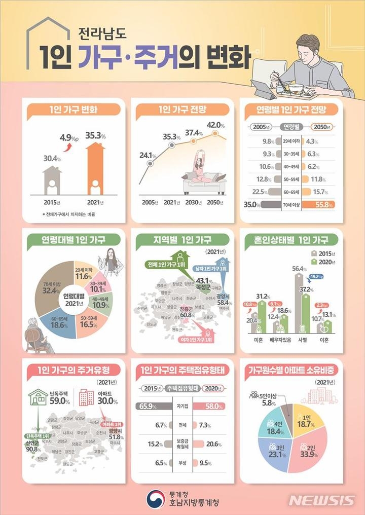 전남지역 1인 가구는 전체 가구(77만7천358가구)의 35.3%인 27만 4천108가구였다.