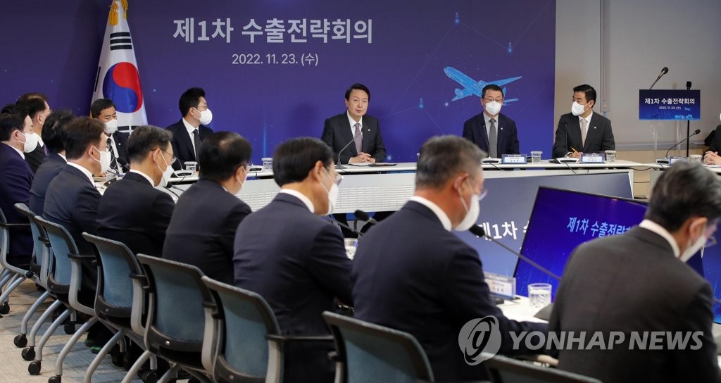SEOUL, Nov. 23 (Yonhap) -- President Yoon Suk-yeol said Wednesday the government must use diplomacy and other means to help increase exports and pave the way for businesses' expansion overseas.