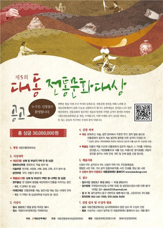 (광주=연합뉴스) 형민우 기자 = 대동문화재단은 24일 지역의 문화예술 진흥에 공헌한 장인과 미래 인재 발굴을 위해 11월 25일까지 대동전통문화대상 후보자를 접수한다고 밝혔다.