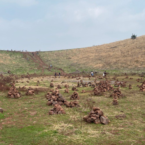 무심결에 쌓은 돌탑에 제주 금오름 맹꽁이 숨 가빠져