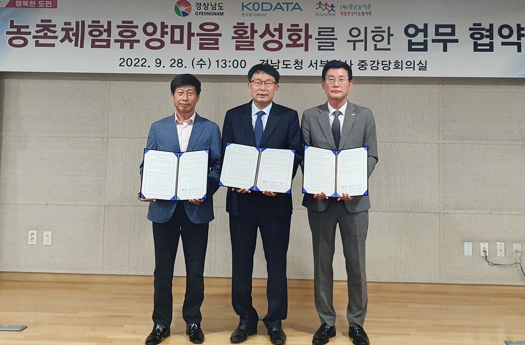 (창원=연합뉴스) 경남도는 28일 도청 서부청사에서 한국평가데이터(KoDATA), 경남농어촌체험휴양마을협의회와 농촌체험휴양마을 활성화를 위한 상호 협력 업무협약을 했다.