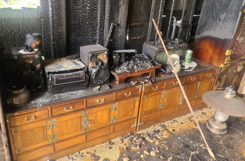 안을 들여다보자 창호지는 불에 타 벗겨졌고, 목재로 된 수납장과 그 위에 놓인 가재도구들이 새카맣게 타버린 탓에 바닥에는 검은 재들이 널브러져 있었다.