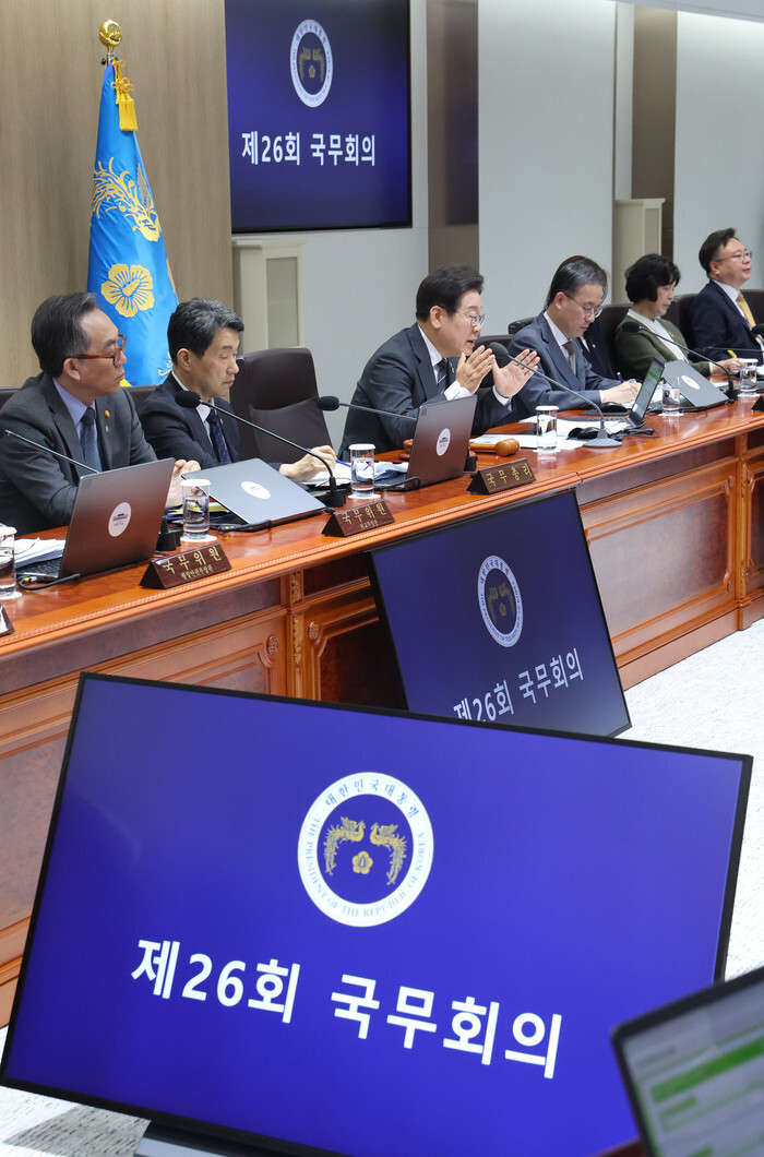 President Lee Jae Myung (C) speaks during a Cabinet meeting at the presidential office in Seoul on June 19, 2025. (Yonhap)