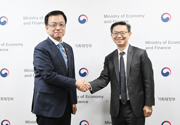 Acting President Choi Sang-mok (L), who concurrently serves as deputy prime minister for economic affairs and finance minister, poses for a photo with Kim Eng Tan, senior director of Asia-Pacific sovereign ratings at Standard & Poor's Global Ratings, during their meeting at the government complex in Seoul on March 14, 2025, in this photo released by the finance ministry. (PHOTO NOT FOR SALE) (Yonhap)