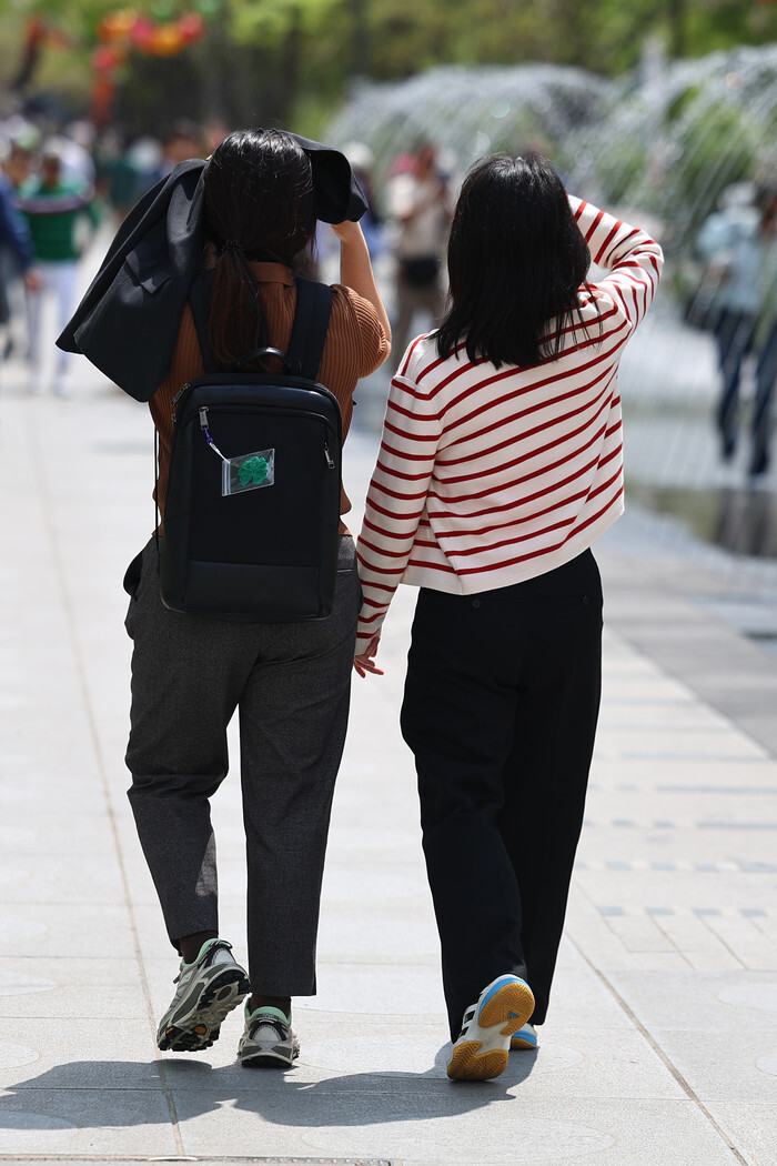 People cover their face from the sunlight with clothes or a hand at Gwanghwamun Plaza in Seoul on April 21, 2025, as South Korea experiences early summer weather, with the temperature climbing to an intraday high of 26 C in the South Korean capital. (Yonhap)