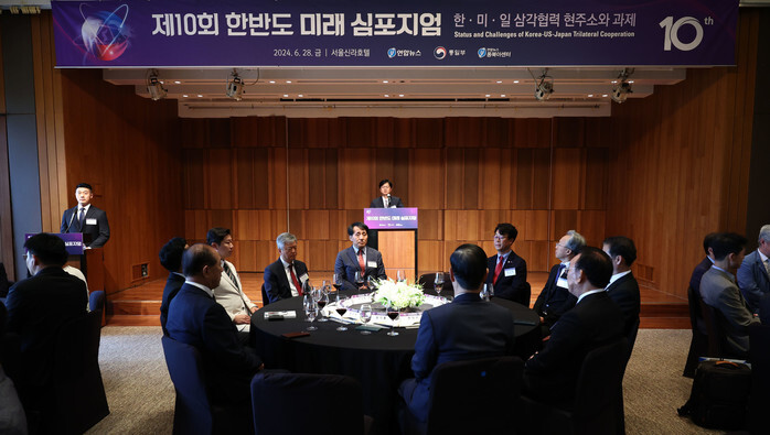Seong Ghi-hong, president and CEO of Yonhap News Agency and Yonhap News TV, delivers a welcome speech during a luncheon with other participants at an annual Korean Peninsula symposium, titled "The Status and Challenges of Korea-U.S.-Japan Trilateral Cooperation," in Seoul on June 28, 2024. Yonhap and the unification ministry co-organized the event. (Yonhap)