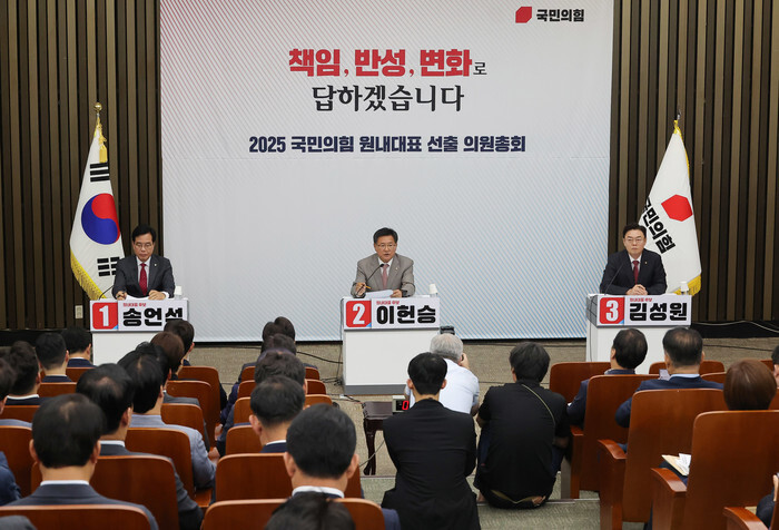 Candidates of the opposition People Power Party -- (from L to R) Song Eon-seok, Lee Heon-seung and Kim Seong-won -- attend a general meeting of the party's lawmakers at the National Assembly in Seoul on June 16, 2025, to choose its new floor leader. (Yonhap)