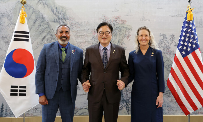 National Assembly Speaker Woo Won-shik (C) poses for a photo with Ami Bera (L) and Jennifer Kiggans, members from the U.S. Congressional Study Group on Korea, during their meeting at the parliament building in Seoul on April 17, 2025, in this photo released by Woo's office. (PHOTO NOT FOR SALE) (Yonhap)