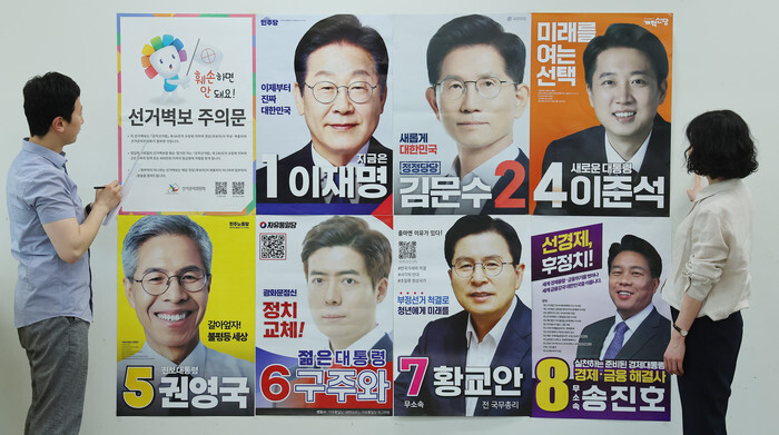 Employees check posters showing political parties' and independent candidates for the June 3 presidential election at an office of the National Election Commission in Incheon, west of Seoul, on May 14, 2025. (Pool photo) (Yonhap)