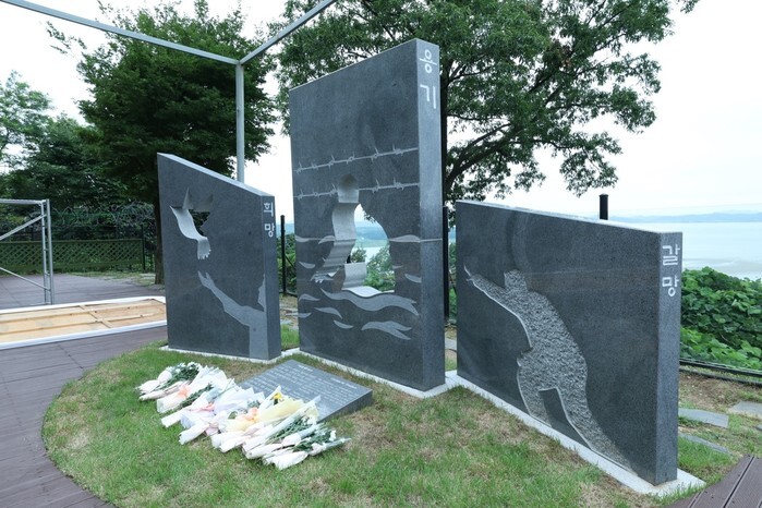 A monument honoring North Korean defectors is unveiled at an observatory in the South Korean western border town of Paju, 37 kilometers northwest of Seoul, on Aug. 1, 2024, on the occasion of North Korean Defectors' Day, in this photo provided by the unification ministry. (PHOTO NOT FOR SALE) (Yonhap)