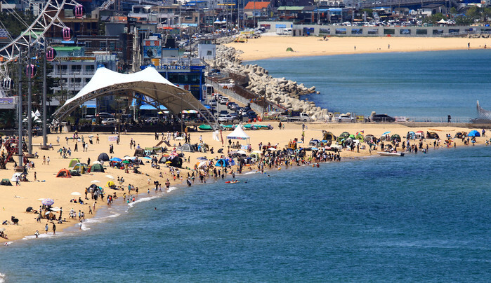 A beach in Sokcho, 210 kilometers east of Seoul, is crowded with people on May 28, 2022, as temperatures went up to over 30 C in regions on the east coast. (Yonhap)