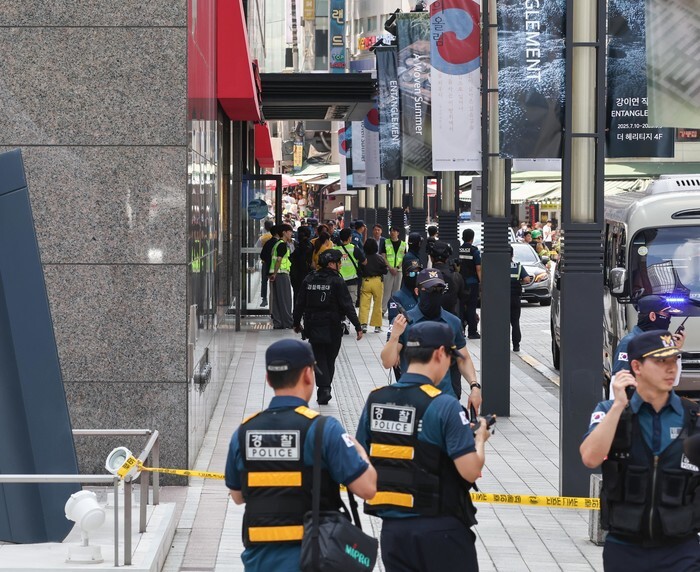 Police officers patrol outside Shinsegae Department Store in Myeongdong, a major shopping district in Seoul, on Aug. 5, 2025, as the facility was sealed off after receiving a threat that an explosive had been placed on the first floor of the facility. (Yonhap)
