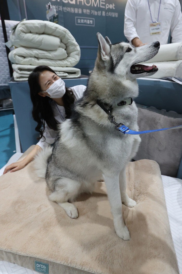 Industry fair on pet goods A pet dog sits on a mattress for dogs displayed at a pet goods fair at the SETEC exhibition hall in Seoul on Feb. 3, 2023. (Yonhap)(END)