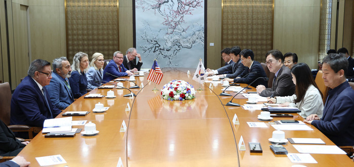 National Assembly Speaker Woo Won-shik (3rd from R) holds talks with members from the U.S. Congressional Study Group on Korea during their meeting at the parliament building in Seoul on April 17, 2025, in this photo released by Woo's office. (PHOTO NOT FOR SALE) (Yonhap)