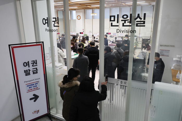 The passport issuance department of the Jongno ward office in Seoul bustles with applicants on Jan. 18, 2022, as the country moves toward a return to normal life with a gradual decrease in new coronavirus cases. (Yonhap)