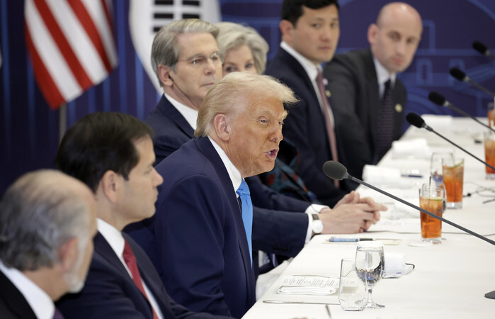 U.S. President Donald Trump (3rd from L) speaks to South Korean President Lee Jae Myung during their talks at the Gyeongju National Museum in Gyeongju, North Gyeongsang Province, southeastern South Korea, on Oct. 29, 2025. (Pool photo) (Yonhap)