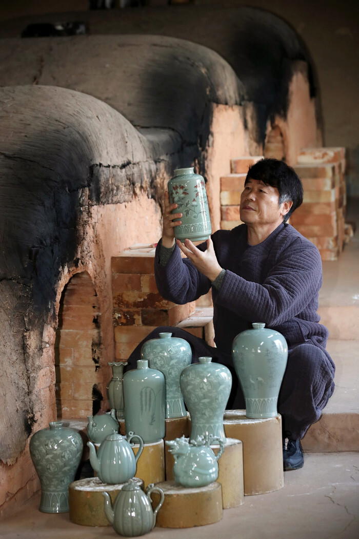 Cho Yoo-bok, a potter, checks baked Goryeo porcelains from a kiln during a celadon festival in Gangjin, a town in South Korea's southwestern province of South Jeolla Province, on Feb. 23, 2023. The festival, which opened the same day, is slated to run till March 1 in the town known as the birthplace and a major production base of Goryeo celadon. (Yonhap)