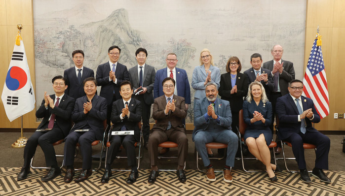 National Assembly Speaker Woo Won-shik (C, 1st row) poses for a group photo with members from the U.S. Congressional Study Group on Korea during their meeting at the parliament building in Seoul on April 17, 2025, in this photo released by Woo's office. (PHOTO NOT FOR SALE) (Yonhap)