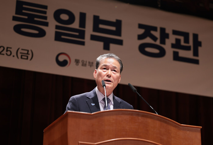 Outgoing Unification Minister Kim Yung-ho, South Korea's point man on inter-Korean relations, speaks during a ceremony at the government complex in Seoul on July 25, 2025, to mark his departure from the post. (Yonhap)